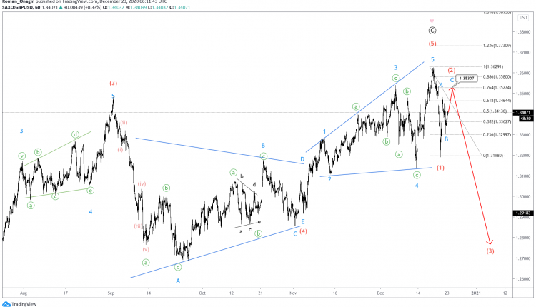 GBPUSD seems to have formed a cycle degree wave e that consists of primary corrective sub-waves Ⓐ-Ⓑ-Ⓒ. Wave e is part of a large triangle.