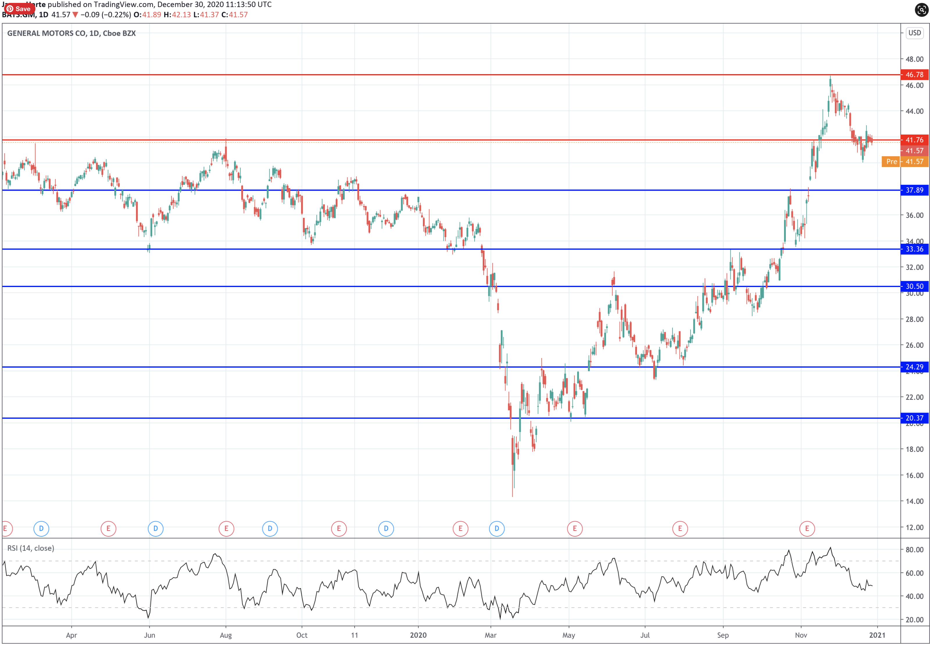 Shares in US vehicle maker General motors are trading a little lower pre-market on Wednesday. Shares have made a fairly steady recovery off the Q1 lows rallying over 200% of the mid 14 lows to highs of around 47. While some of these gains were given back over recent weeks, trading down to mid 41 currently, the stock is still up on the year.