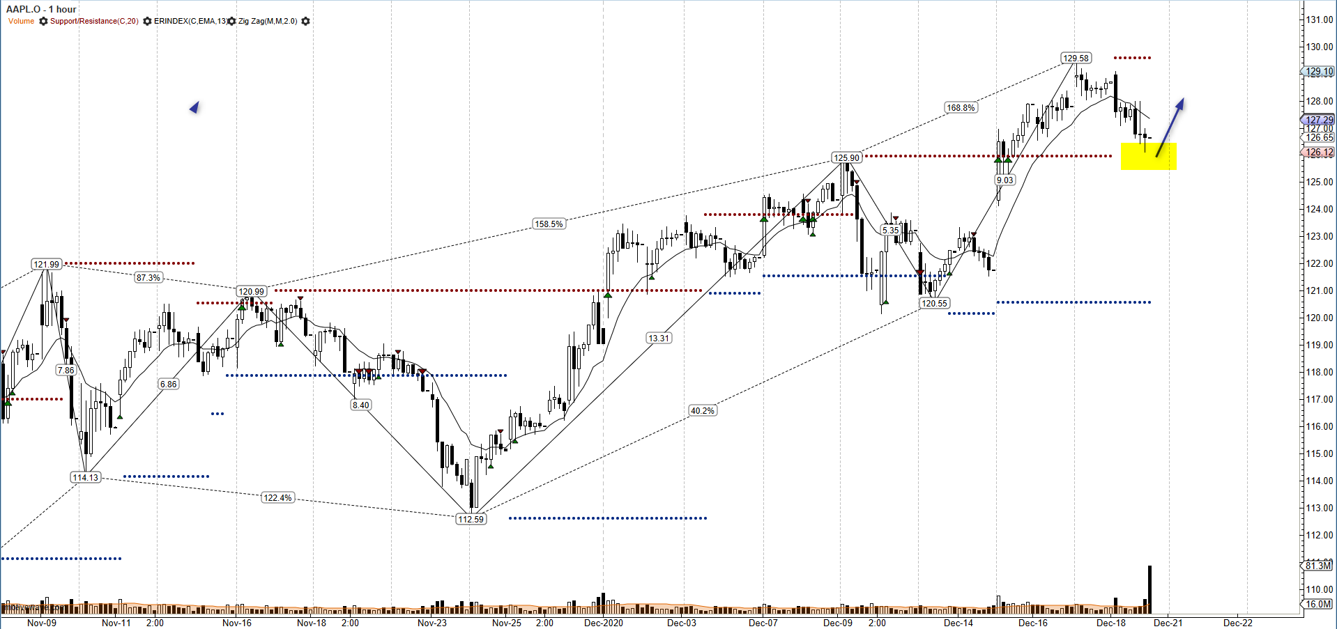 Il titolo Apple è visto in fase di assestamento, dopo i massimi segnati appeno sotto quota 130, ma le implicazioni tecniche assunte depongono sempre a favore di una continuazione del trend rialzista, sostenuto strutturalmente dai supporti visti tra quota 121 e 126 dollari.