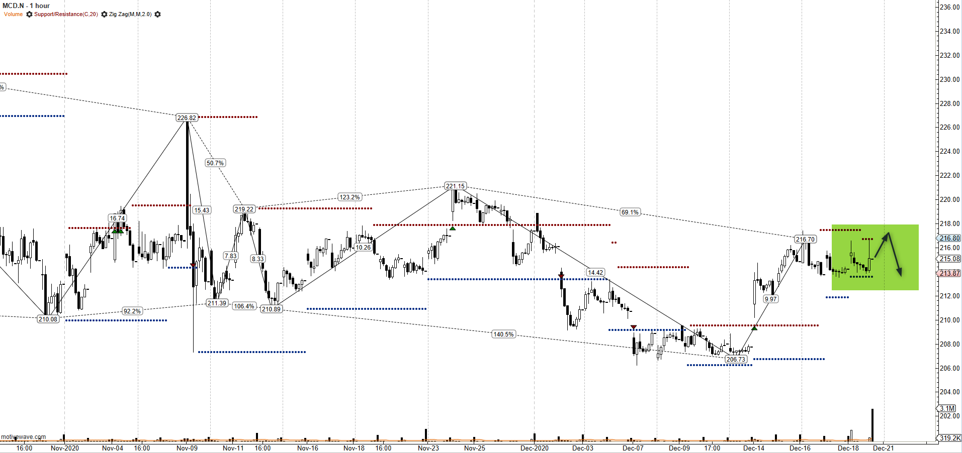 Situazione sostanzialmente neutra per il titolo McDonald’s, inscatolato in un box che perdura dallo scorso 26 ottobre, con livelli di supporto e resistenza rispettivamente posti a 210 e 220, eccezion fatta per estemporanei eccessi.