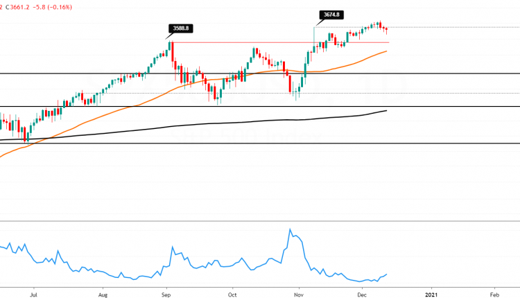 To the downside, if the S&P500 loses the support of 3588 and the 50-day moving average, then we expect a correction down to the 3388 level. This would still keep the bias in the index to the upside albeit weaker.