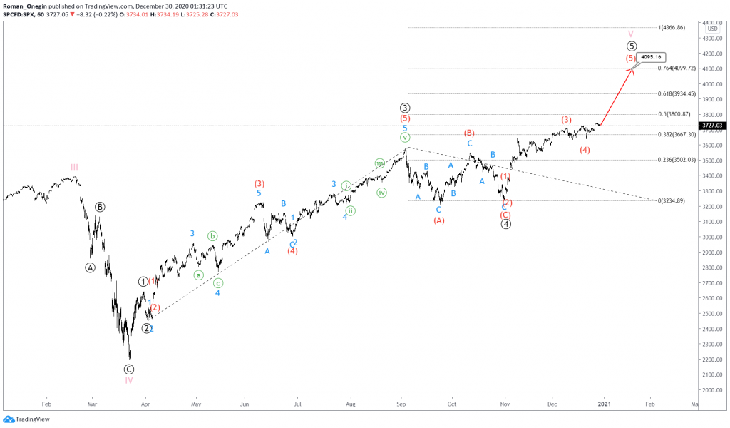 Currently, we are at the beginning of the final corrective wave (E). Its end is expected near 3360.57, where is will be at 76.4% of wave (D).