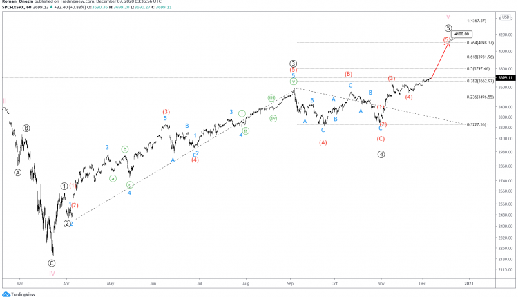The end of the intermediate wave (5) could take prices up to 4100.00. Here, primary wave ⑤ will be at 76.4% of wave ③.
