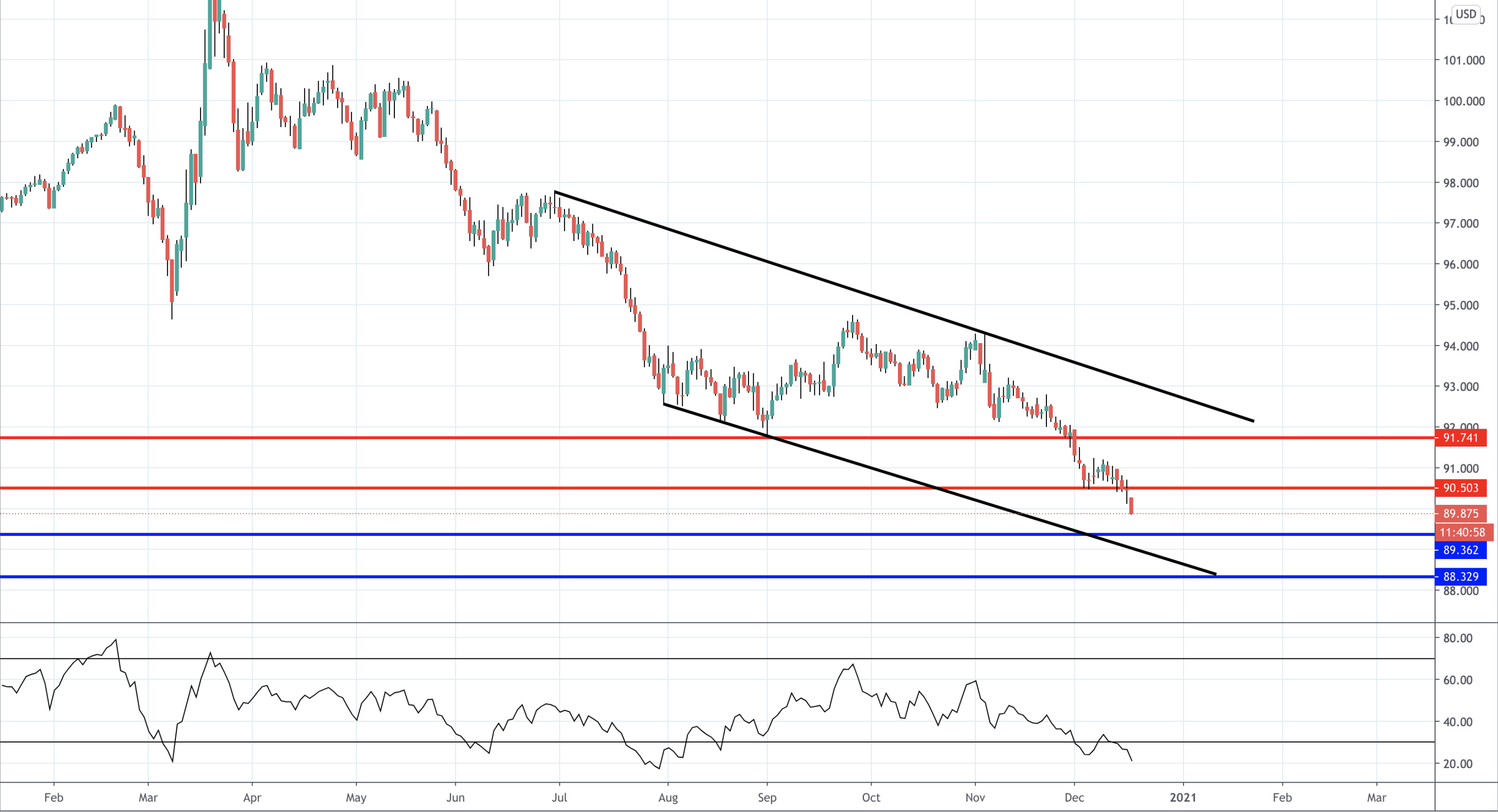 The USD Index is trading lower within a downward channel and has recently broken below the 90.50 support.