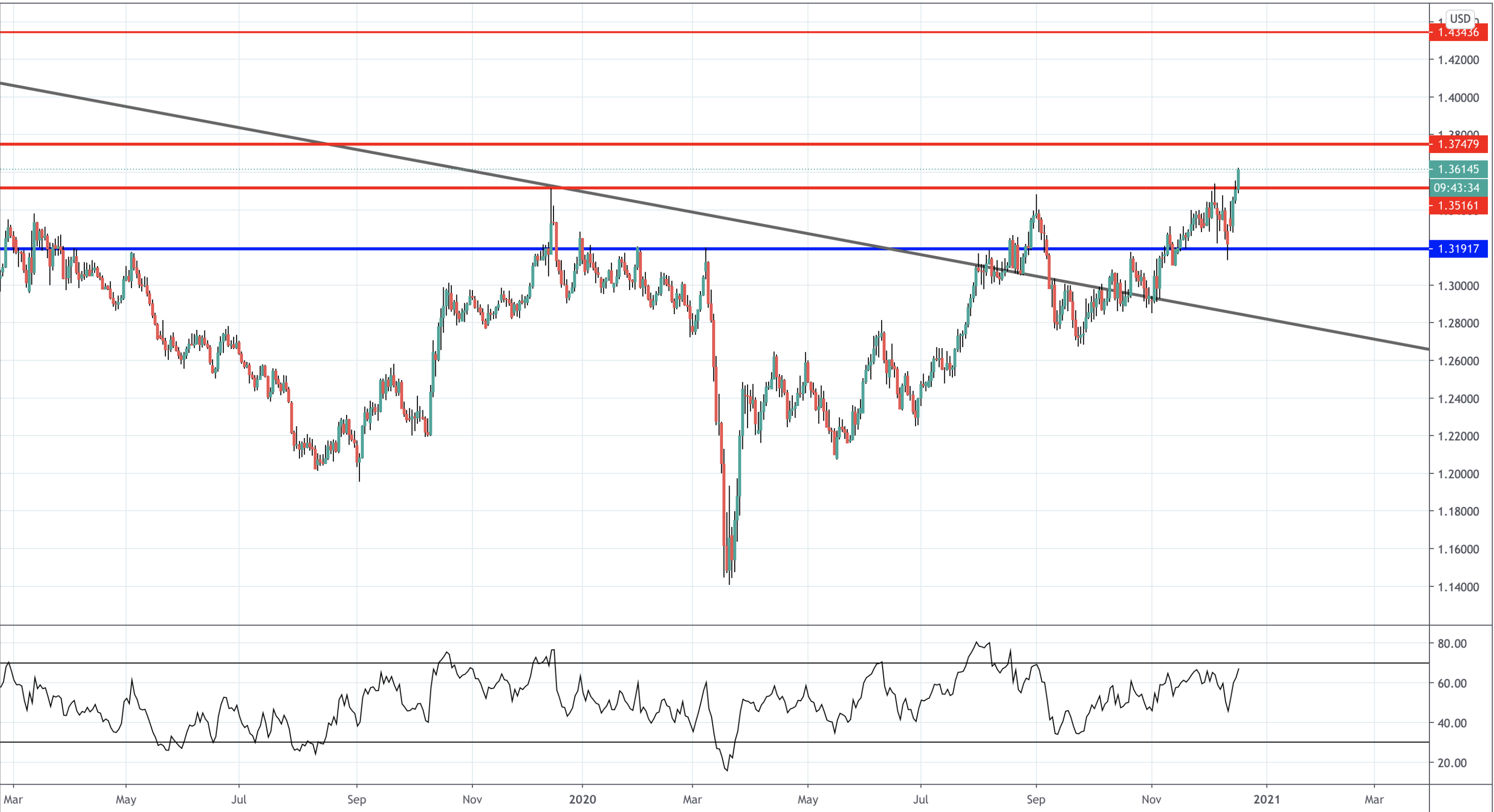 GBPUSD is starting to move above the 1.3516 level which is a major long term resistance level.