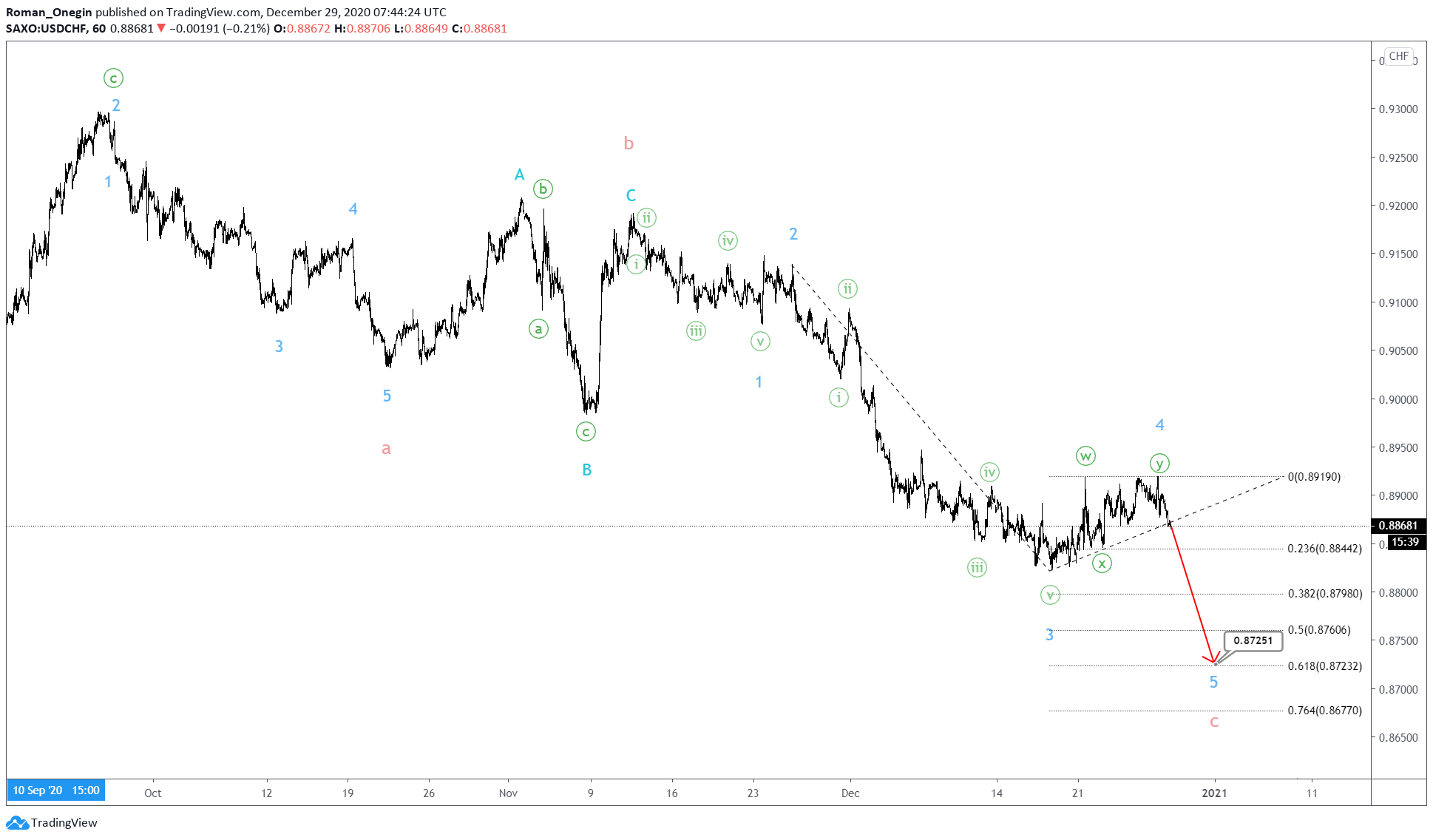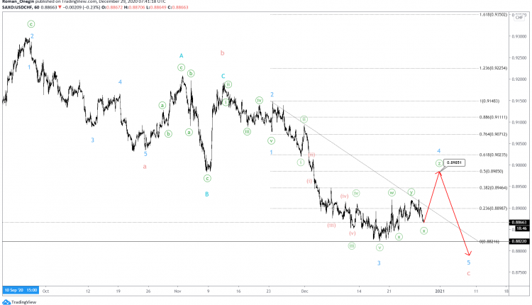 The current USDCHF structure shows the formation of a bearish cycle impulse c, consisting of minor sub-waves 1-2-3-4-5.