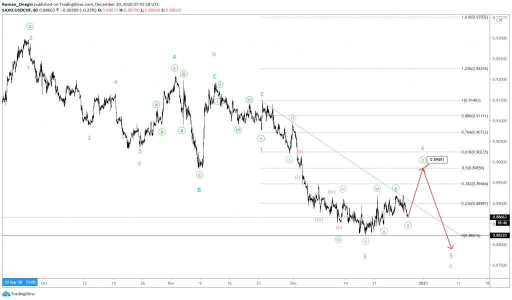 The current USDCHF structure shows the formation of a bearish cycle impulse c, consisting of minor sub-waves 1-2-3-4-5.