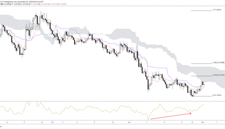 The bottom found at the 17.26/15.10 downside Fibonacci leg, which has seen a recent bounce as momentum escalates. A strong long-term bullish divergence has propelled prices away from the $15 handle, and towards the lower border of the Ichimoku cloud.