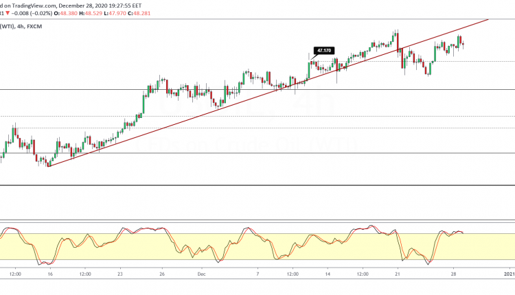 Oil prices maintained their bullish continuation with prices rising in early Monday trading. However, after rising to intraday highs of 48.94, the commodity gave back the gains, forming a lower high.