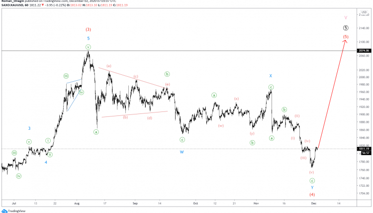 The intermediate correction wave (4) which is a bearish double W-X-Y zigzag has recently ended.