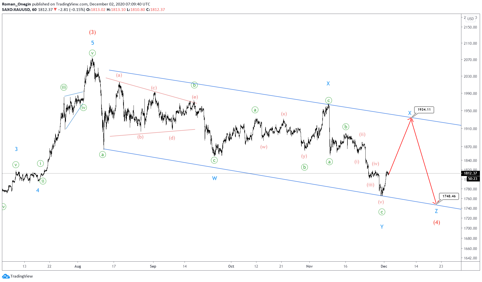 The intermediate correction wave (4) takes the form of a triple W-X-Y-X-Z zigzag. The first four parts of this triple combination have completed.