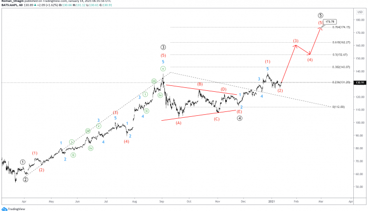 The current AAPL structure hints to a ①-②-③-④-⑤ impulse of the primary degree.