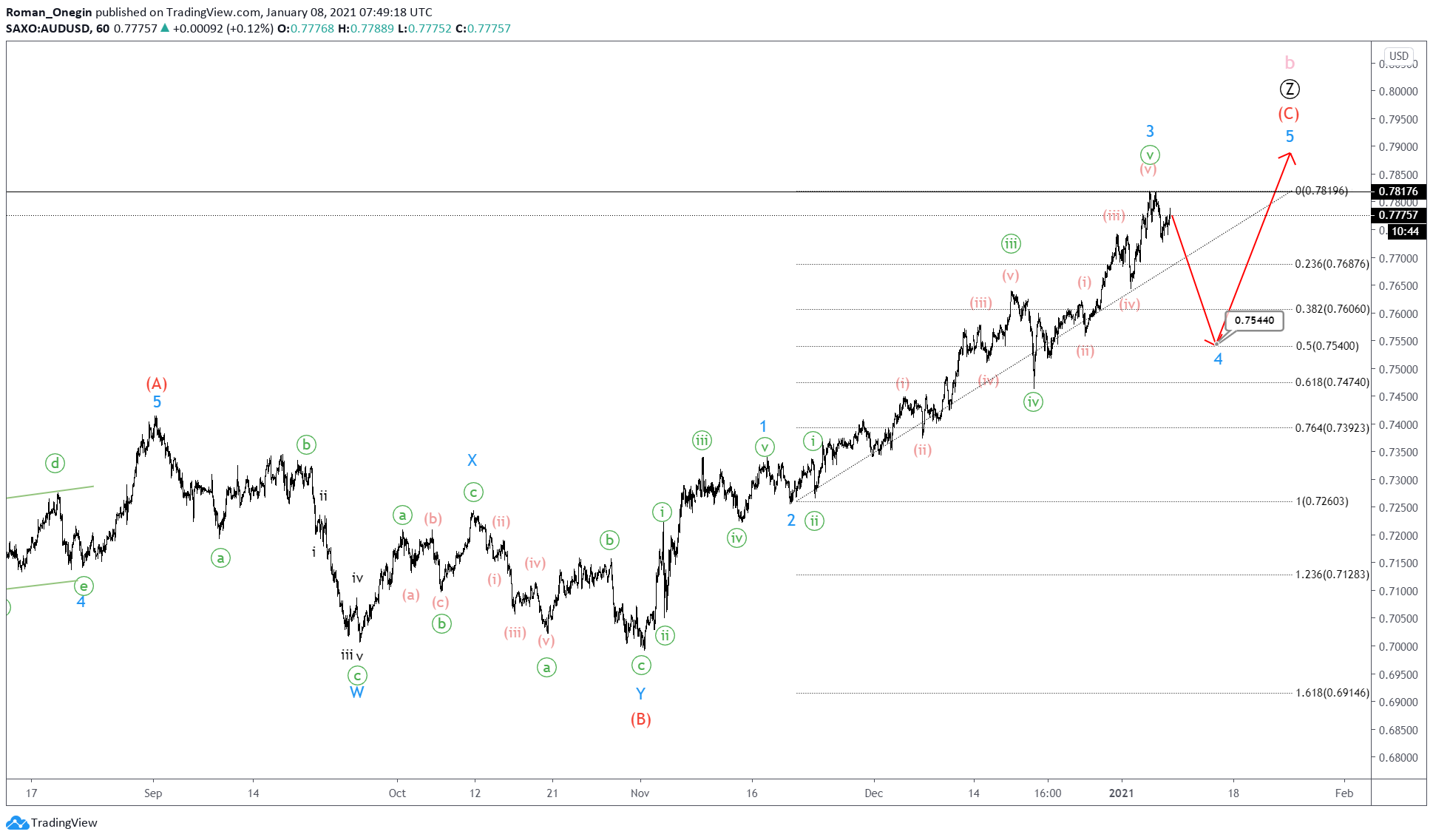 The AUDUSD formation hints at the construction of a bullish cycle correction b, that takes the form of a triple zigzag Ⓦ-Ⓧ-Ⓨ-Ⓧ-Ⓩ of the primary degree.