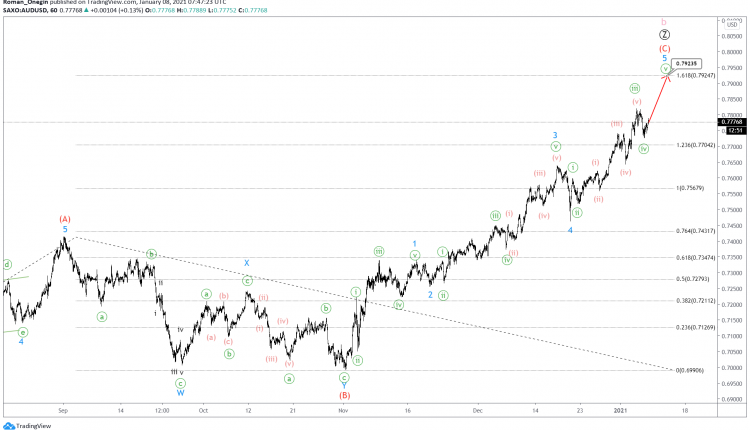 The final wave 5 could end near 0.792. At that level, the intermediate impulsive wave (C) will be at the 61.8% Fibonacci extension of impulse (A).
