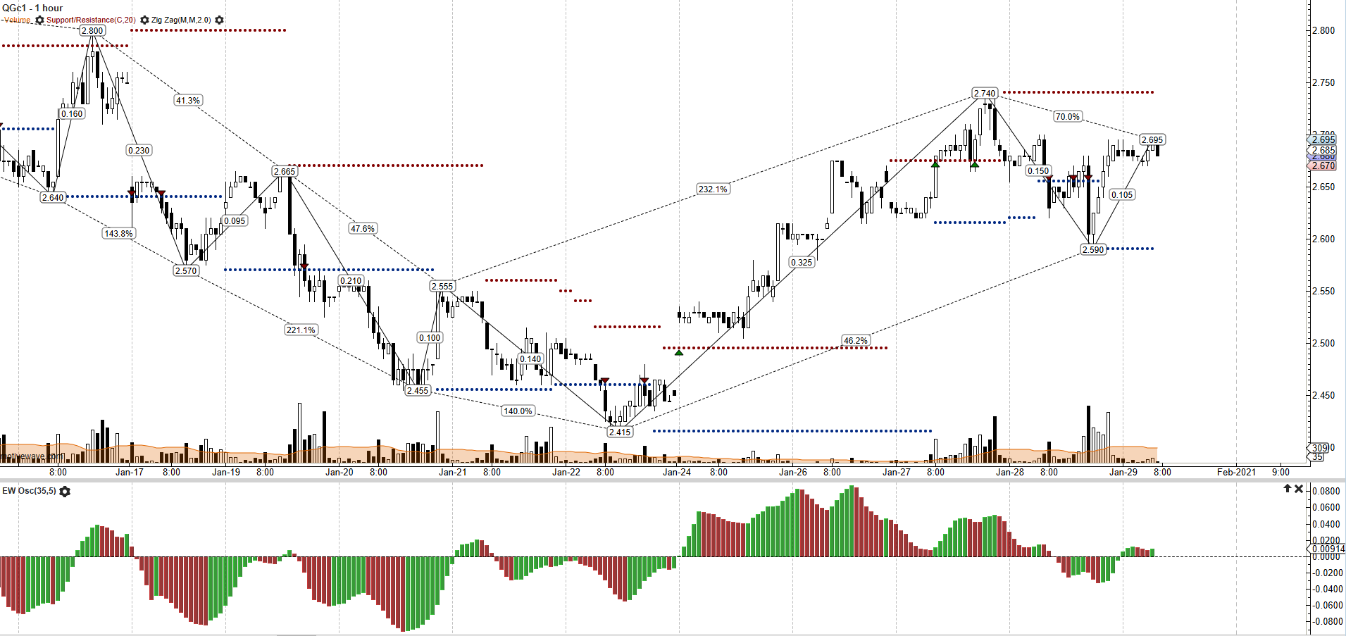 Come si scriveva nel report precedente, le quotazioni del Natural Gas hanno testato una importante resistenza stimata in area 2.74 ed intercettata su 2 STDV sopra la retta di regressione originata sui minimi di breve periodo dello scorso 22 gennaio. La correzione dai massimi dovrebbe aver configurazione temporanea con supporti stimati tra 2.55 e 2.59 e volontà a trovare su livelli di una precedente accumulazione. Il momentum a breve termine è visto ancora in positivo. In area 2.60 si gioca quindi la partita, i cui risvolti operativi decreteranno la direzionalità sul breve periodo. Una rottura al ribasso di questo livello aprirebbe le porte a nuovi ribassi per target stimato tra 2.45 e 2.4, diversamente esisterebbero concrete possibilità di riattaccare i massimi del 27 gennaio a 2.74.