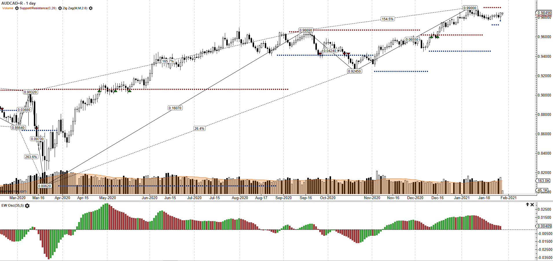 Il Cambio AUDCAD continua a ruotare in area 0.98 che si pone come resistenza ad ulteriori avanzamenti. Strutturalmente il movimento in essere dallo scorso luglio si va ad incastrare come Onda 3 dell’intero processo impulsivo originato sui minimi di marzo in area 0.80. Complicato dipanarne lo sviluppo dei sotto movimenti minori, ma il minimo più recente in area 0.9245 potrebbe aver chiuso in anticipo Onda 4 correttiva e permesso il riattacco ai massimi in definizione di Onda 5. Vedremo se questo sarà lo scenario più coerente con le implicazioni tecniche assunte che osservano un momentum in grande forza e una impostazione rialzista di tutte le medie di riferimento, peraltro senza scarti speculativi. Riepilogando, la resistenza è stimata 0.99, per cui rimanere al di sopra di quota 0.970 è cruciale per attaccare le resistenze “lunghe” e andare ad esplorare nuovi massimi di periodo.