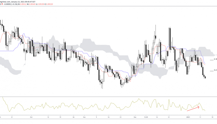 Prices are currently hovering at the low 0.89 range, with the risk of plummeting lower should a break occur.