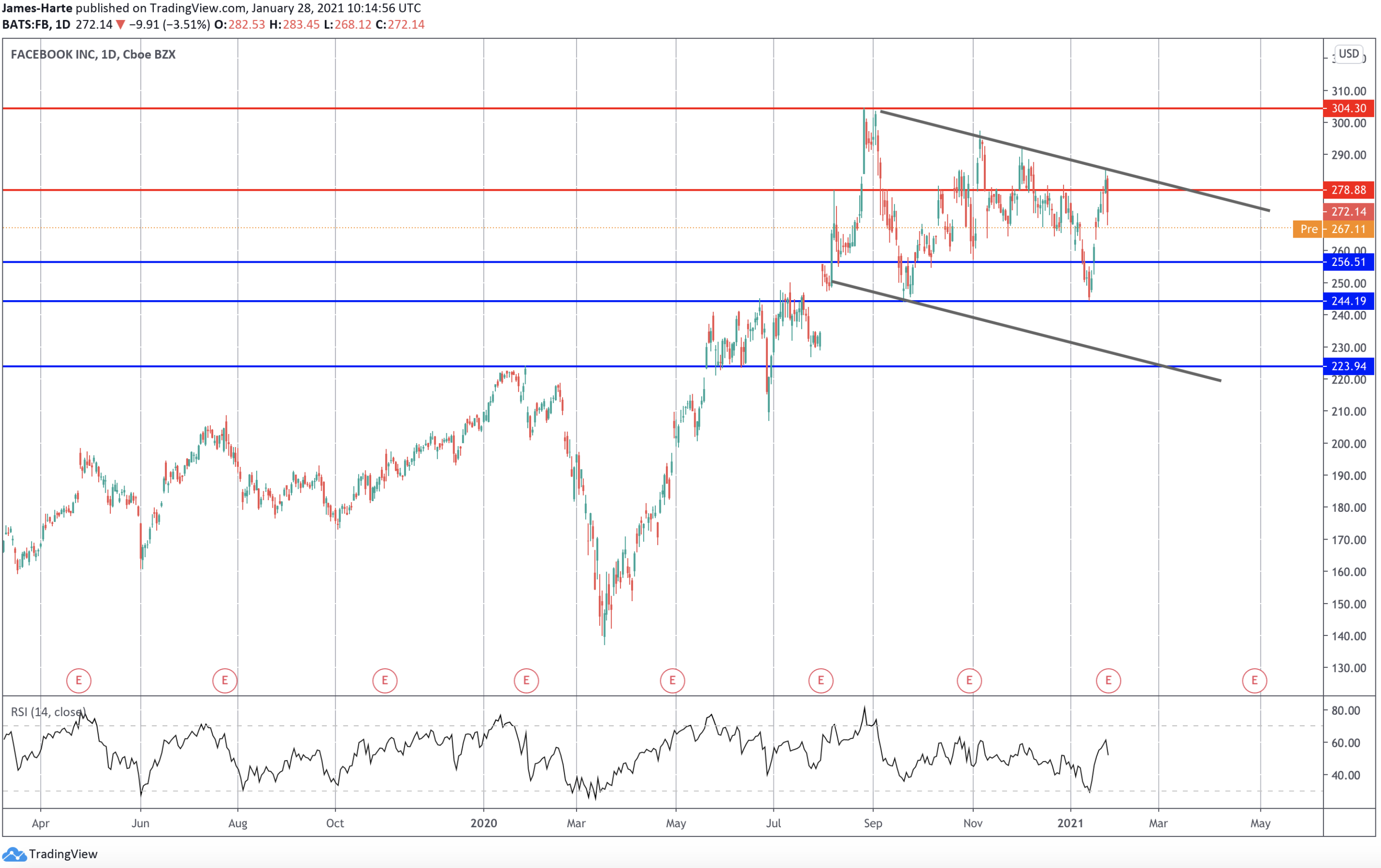 Price was recently capped at the 278.88 level and the channel top. For now, Facebook is broadly trading within a corrective bearish channel to the longer-term bull trend.