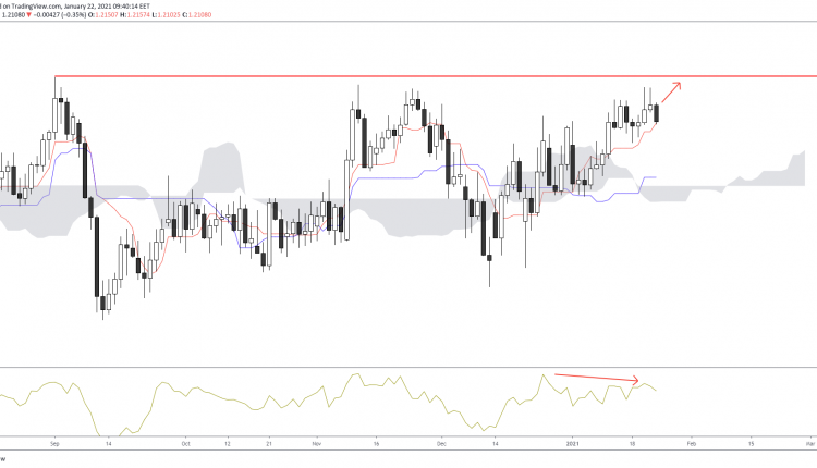 The recent bearish divergence brought prices lower, touching the top border of the Ichimoku cloud in the process. Should cloud engulfment take place, then the 38.2% of the 1.1916/1.2197 Fibonacci leg will be the first target.
