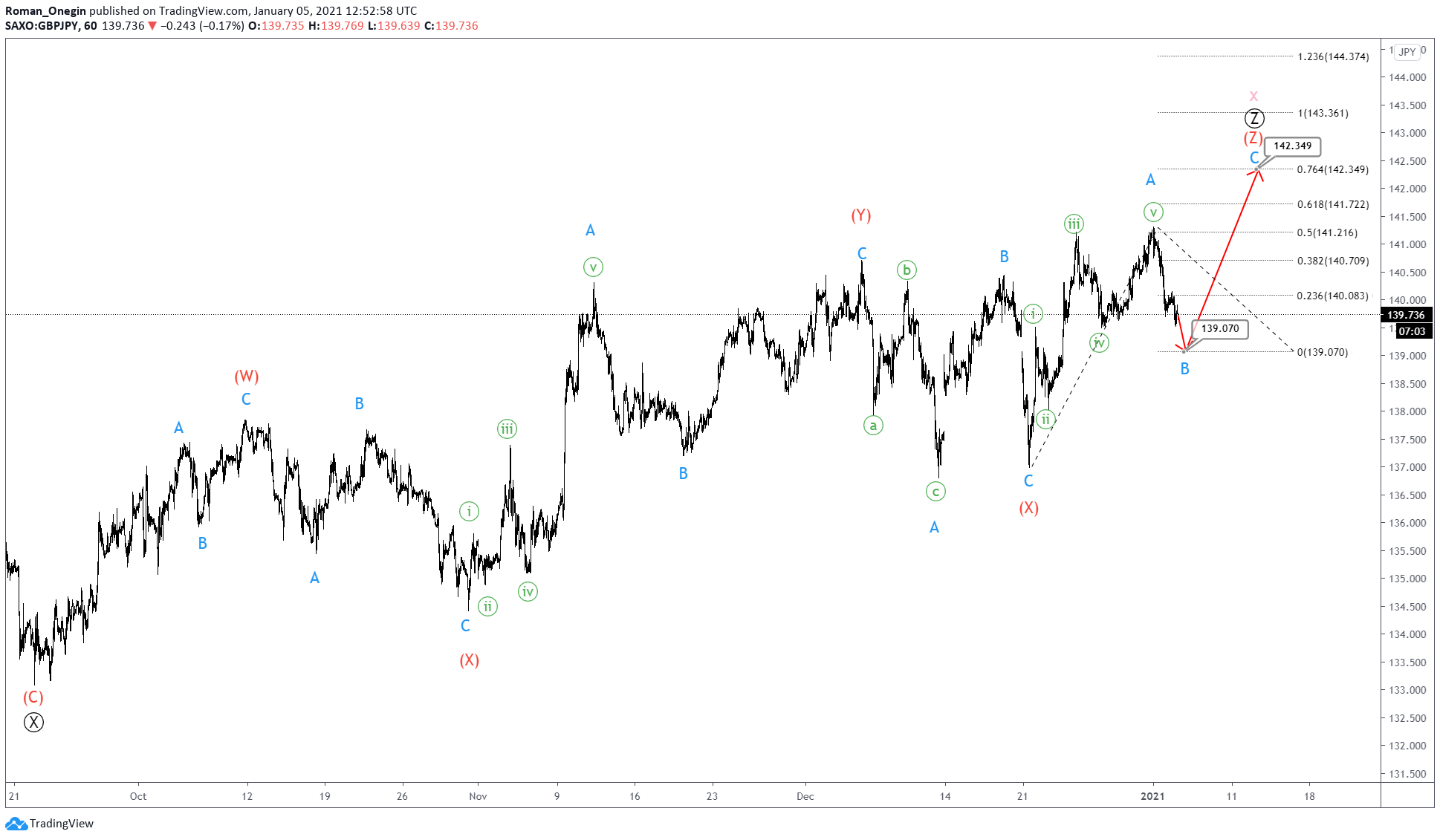 The GBPJPY chart shows the final part of a large triple zigzag consisting of primary sub-waves Ⓦ-Ⓧ-Ⓨ-Ⓧ-Ⓩ.