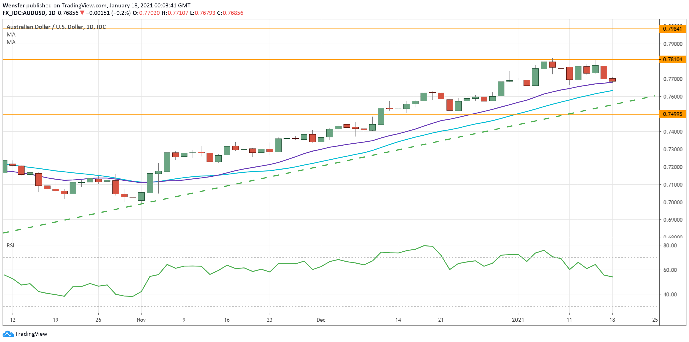 The Aussie’s uptrend will stay intact as long as it stays above 0.7500 along the moving averages. 0.7980 from February 2018 is the next hurdle.