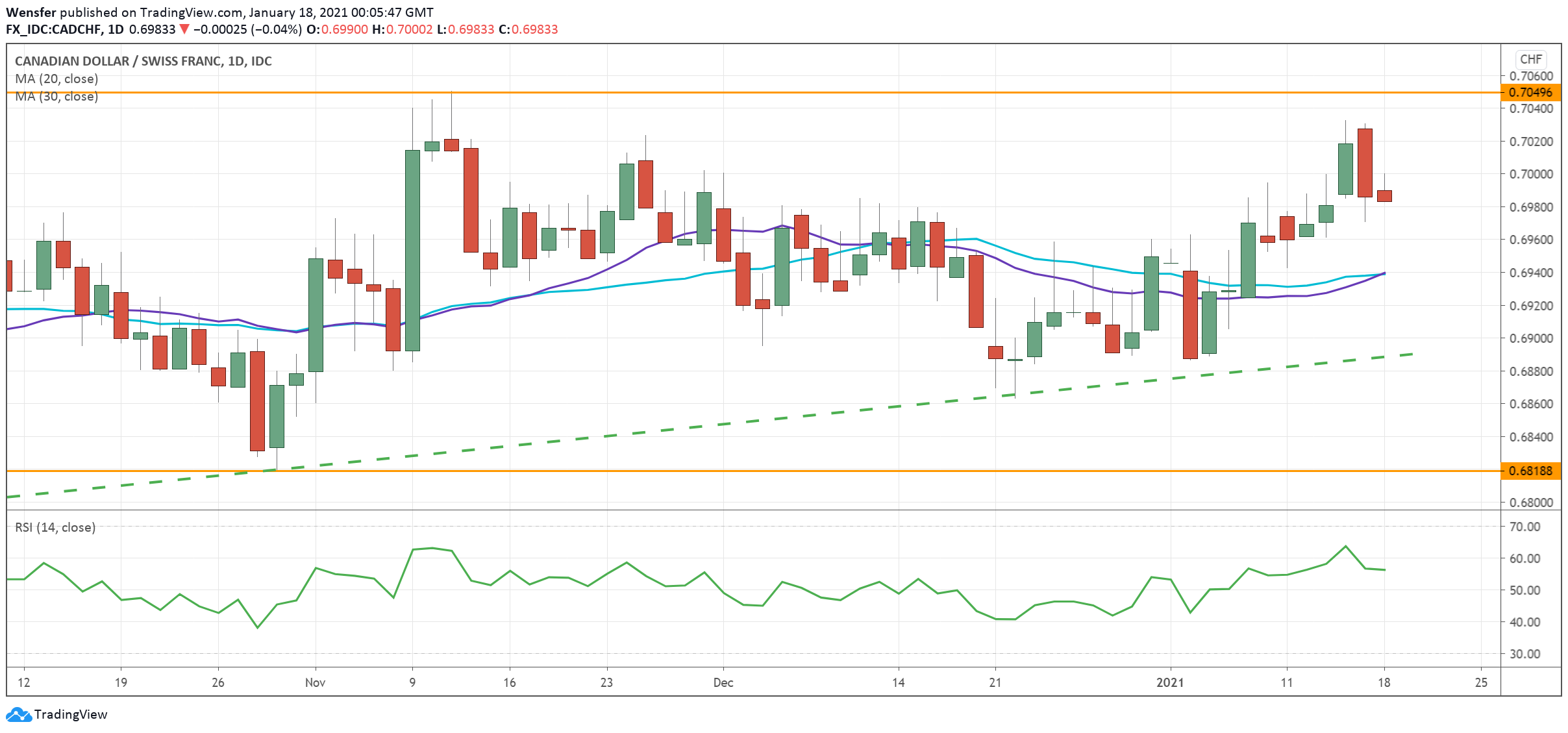 The pair is testing the November high of 0.7050 and a bullish breakout could lead the rally towards 0.7200.