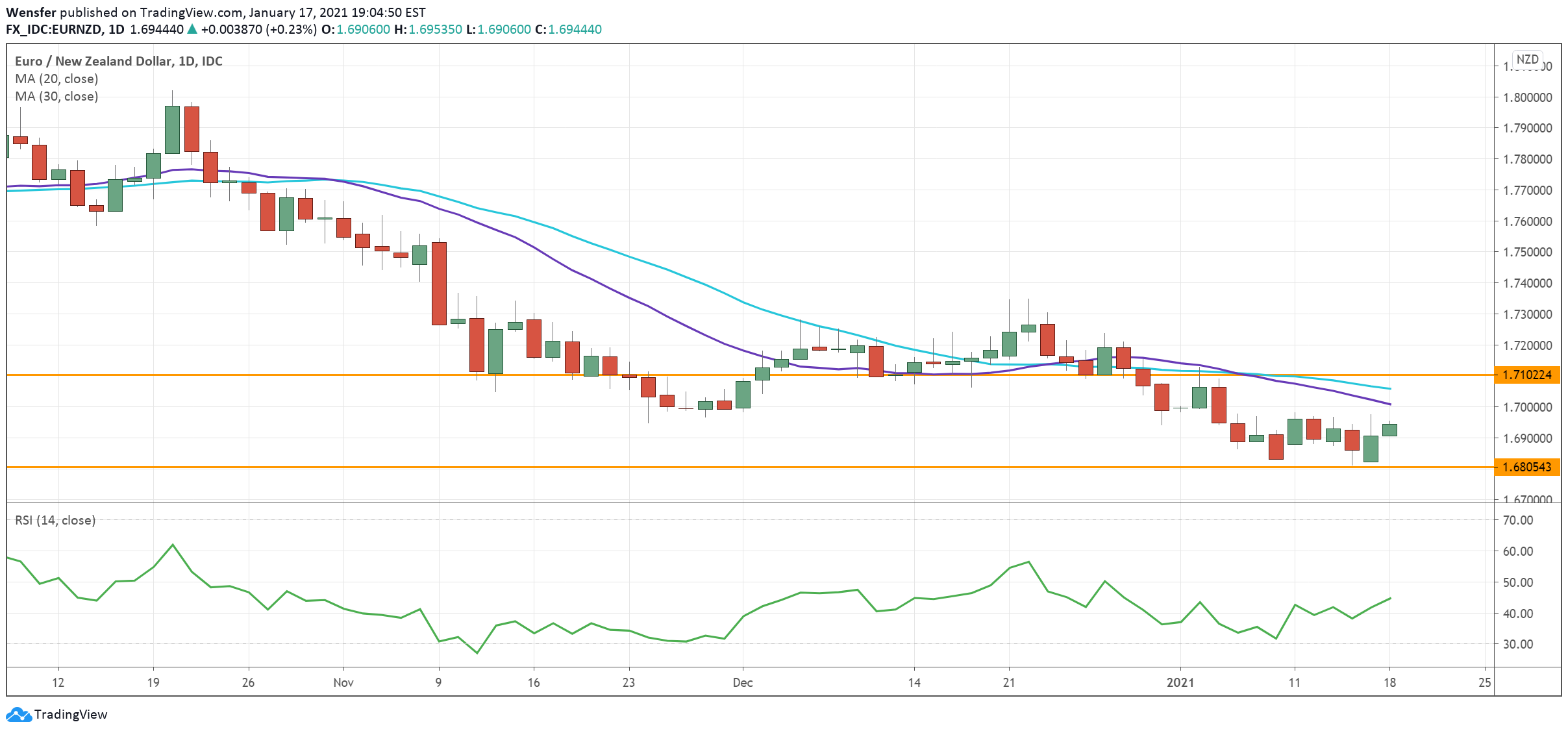 A drop below 1.6800 would send the price towards 1.66. On the upside, 1.7100 is the immediate resistance.