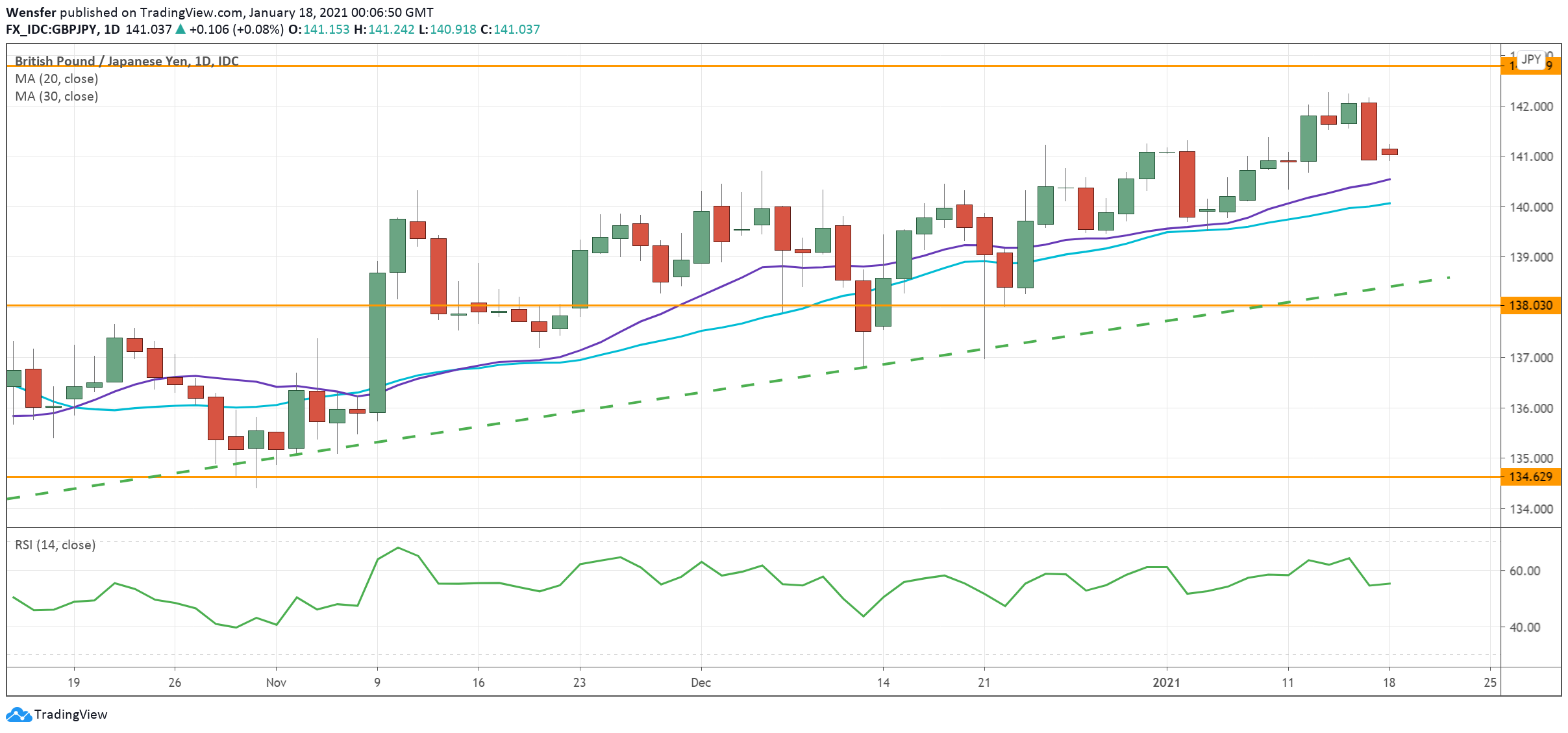 A rally above 142.80 could lift the price towards 145. To the downside, 138.00 along the trendline is a key support level.