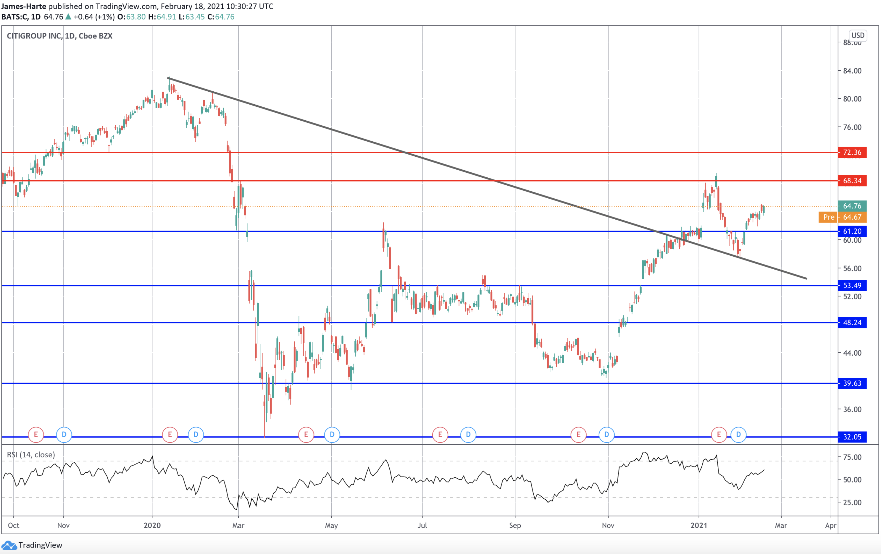 Following the breakout above the breakout above the bearish trend line from 2020 highs, Citi shares found firm selling interest into the 68.34 level. However, the subsequent correction only ran as deep as the retest of the broken trend line, which has since turned price back above the 61.20 level. While above here, the focus is on further upside. A break above the 68.34 level, with 72.36 the next resistance is on the radar for bulls.