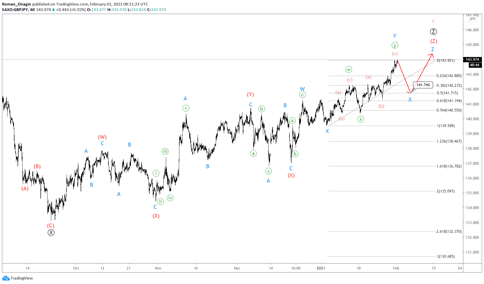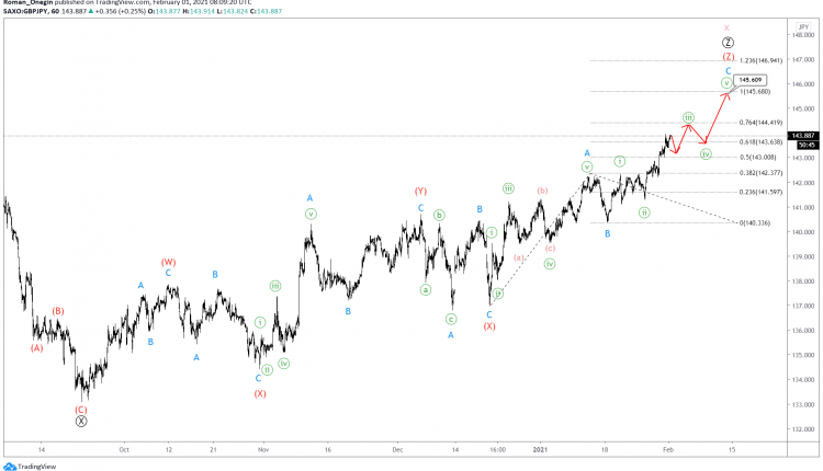 The GBPJPY pair currently shows a bullish intervening wave X of a cycle degree. This takes the form of a triple Ⓦ-Ⓧ-Ⓨ-Ⓧ-Ⓩ zigzag of the primary degree.