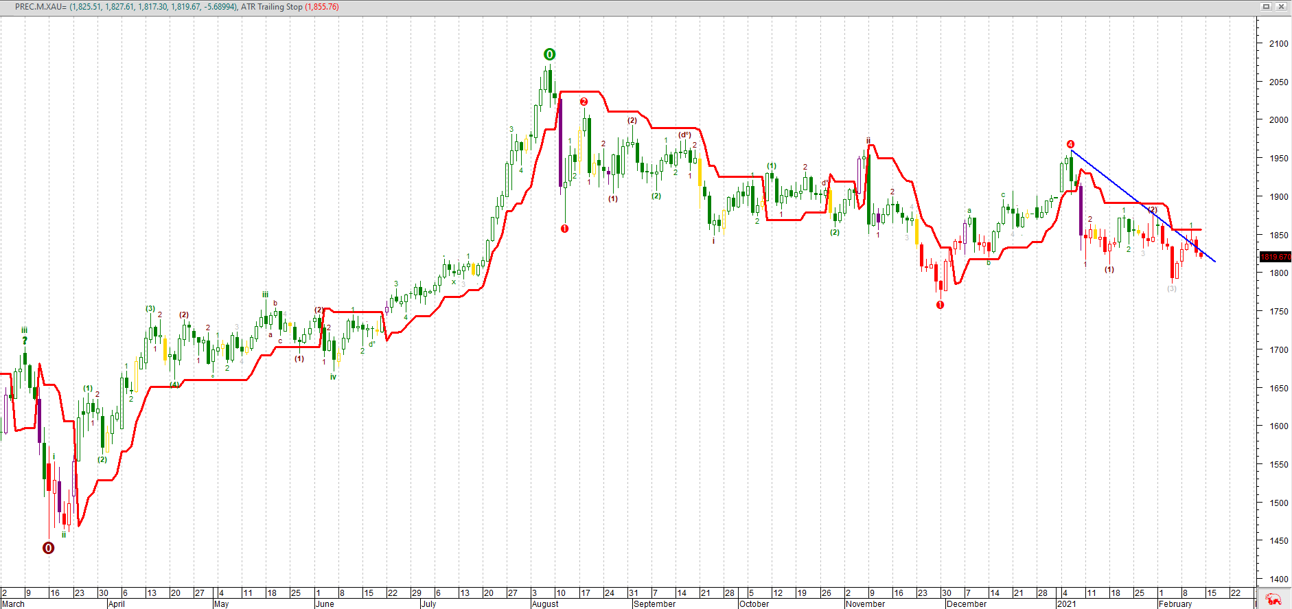 Il GOLD ha fallito il break-out 1,890, configurando un modello di continuazione tipicamente ribassista raccordato sui massimi di gennaio a quota 1.960. In sintesi, il trend di fondo dell’ORO ha assunto una configurazione ribassista di natura impulsiva dopo il reversal dell’agosto scorso, fulcrato su quota 2,080, che verrebbe scardinato solo sopra quota 1,950. Quota 1,950, ovviamente, è una cifra rotonda e psicologicamente significativa; se il GOLD dovesse attaccarla e romperla, il segnale che entrerebbe, oltreché sconfessare l’impulso ribassista, fornirebbe convincenti indicazioni di rialzo. Si ritiene tuttavia che il più recente indebolimento possa attaccare i supporti a quota 1,765 aprendo a movimenti in downside più profondi. Supporto di transizione tecnica a 1,785.
