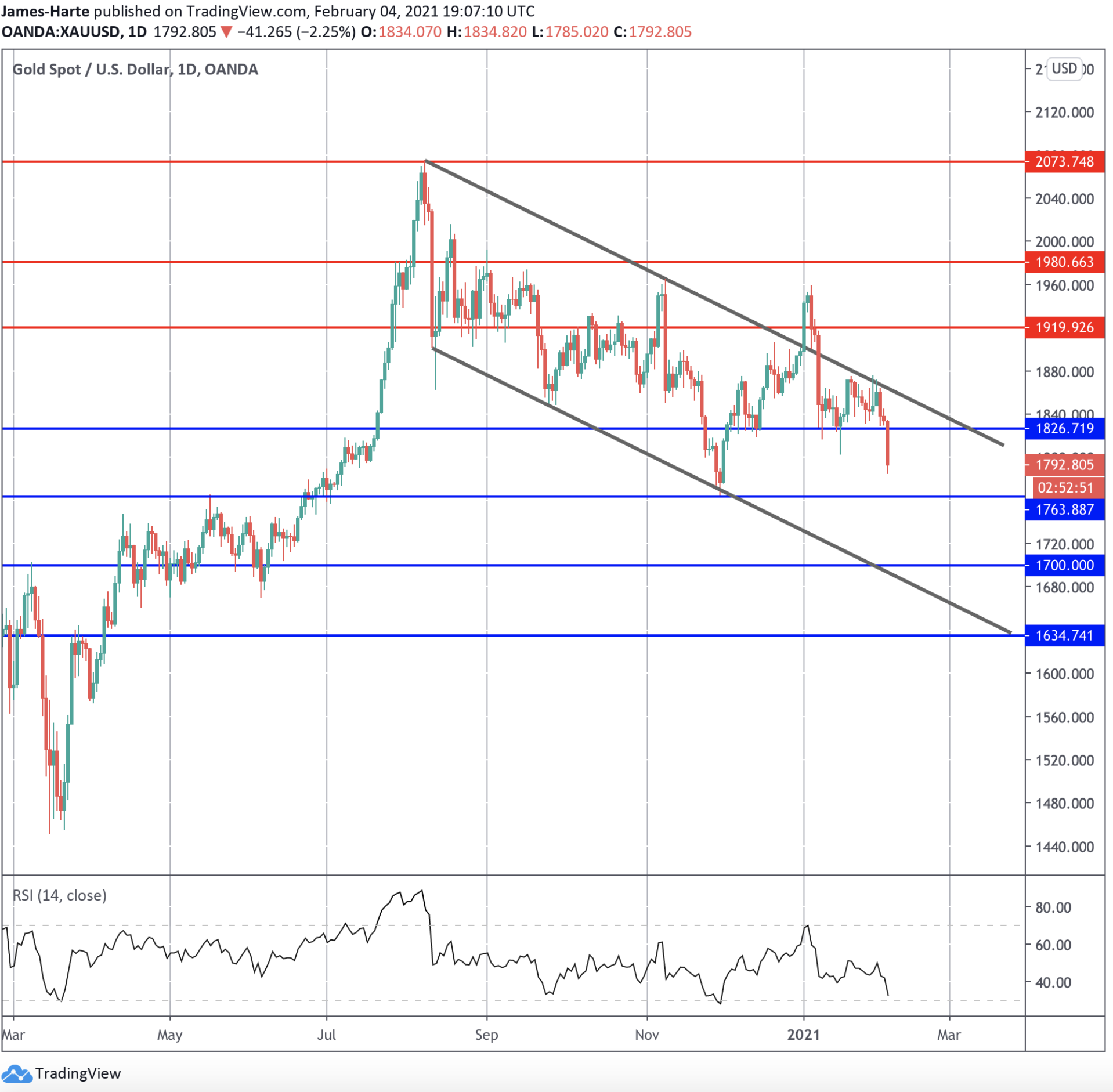 Gold prices broke down further this week with price moving beneath the 1826.71 level. The market is now moving within the bearish channel once again. The next key support to watch is at 1763.88. This marked the low of the Q4 2020 correction and a break below this level would put the focus on a move down to the 17000 level next, where the channel low sits also.