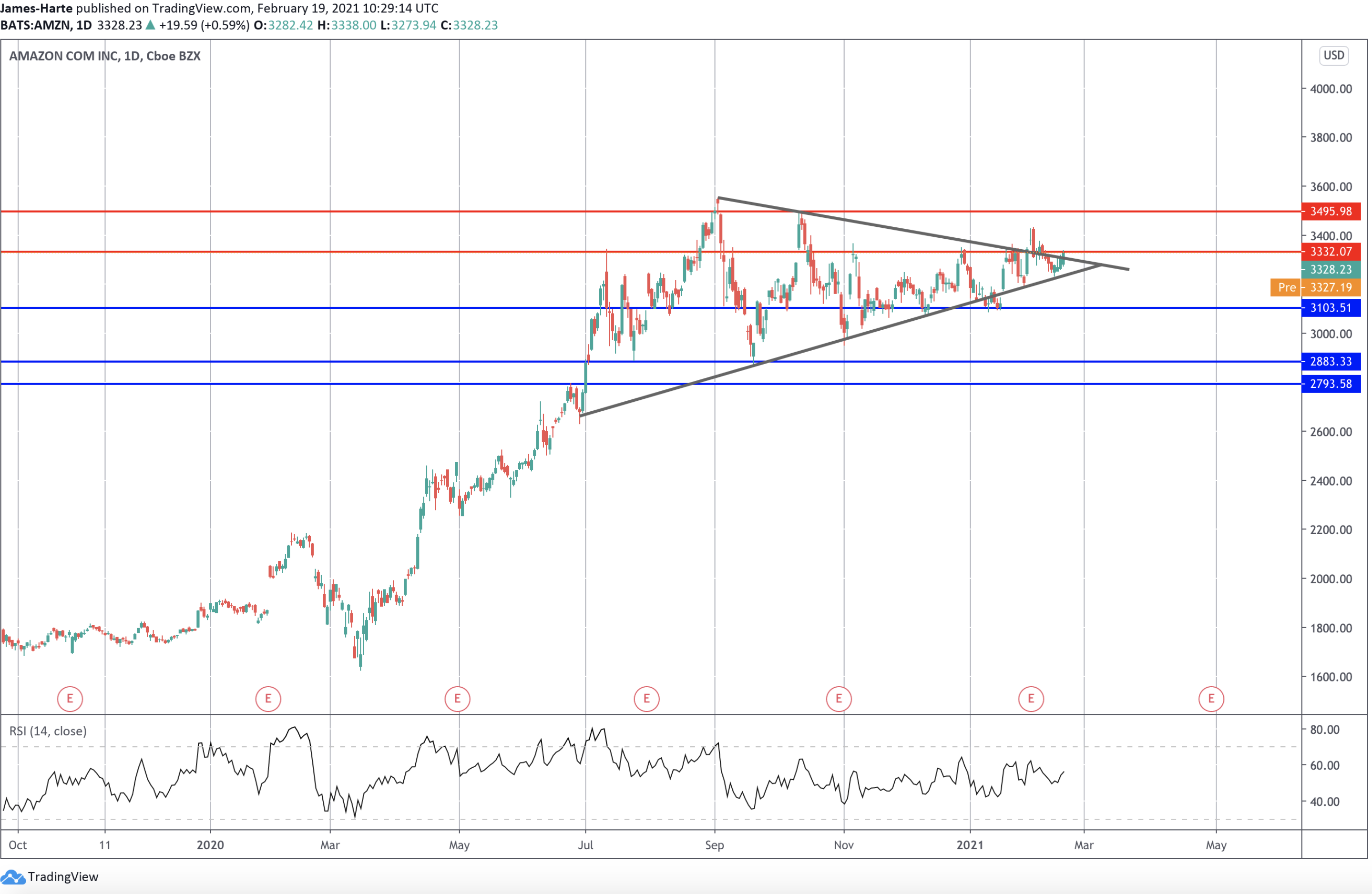 Amazon shares have been trading into the Apex of the contracting triangle pattern which has framed price action since summer 2020. For now, price remains trapped between the 3103.51 level and the 3332.07 levels.