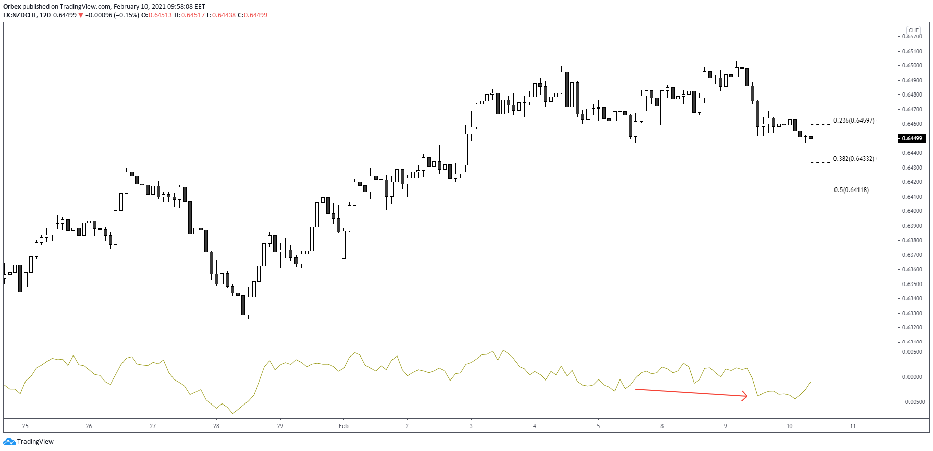 A hidden bullish divergence has put a halt to prices trending any higher. Bears are now targeting the downside bias, with the 23.6% of the 0.6502/0.6320 Fibonacci leg being the first test.