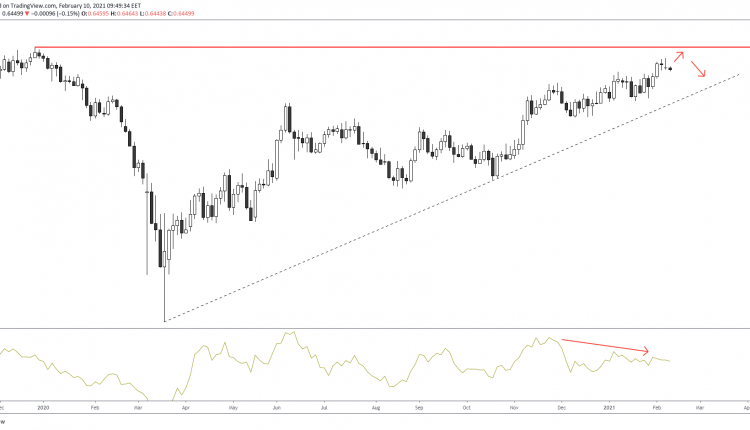To the upside, the trend could continue if the mid-0.65c region can be broken. However, bias will soon shift towards the downside if the long-term support is pierced.