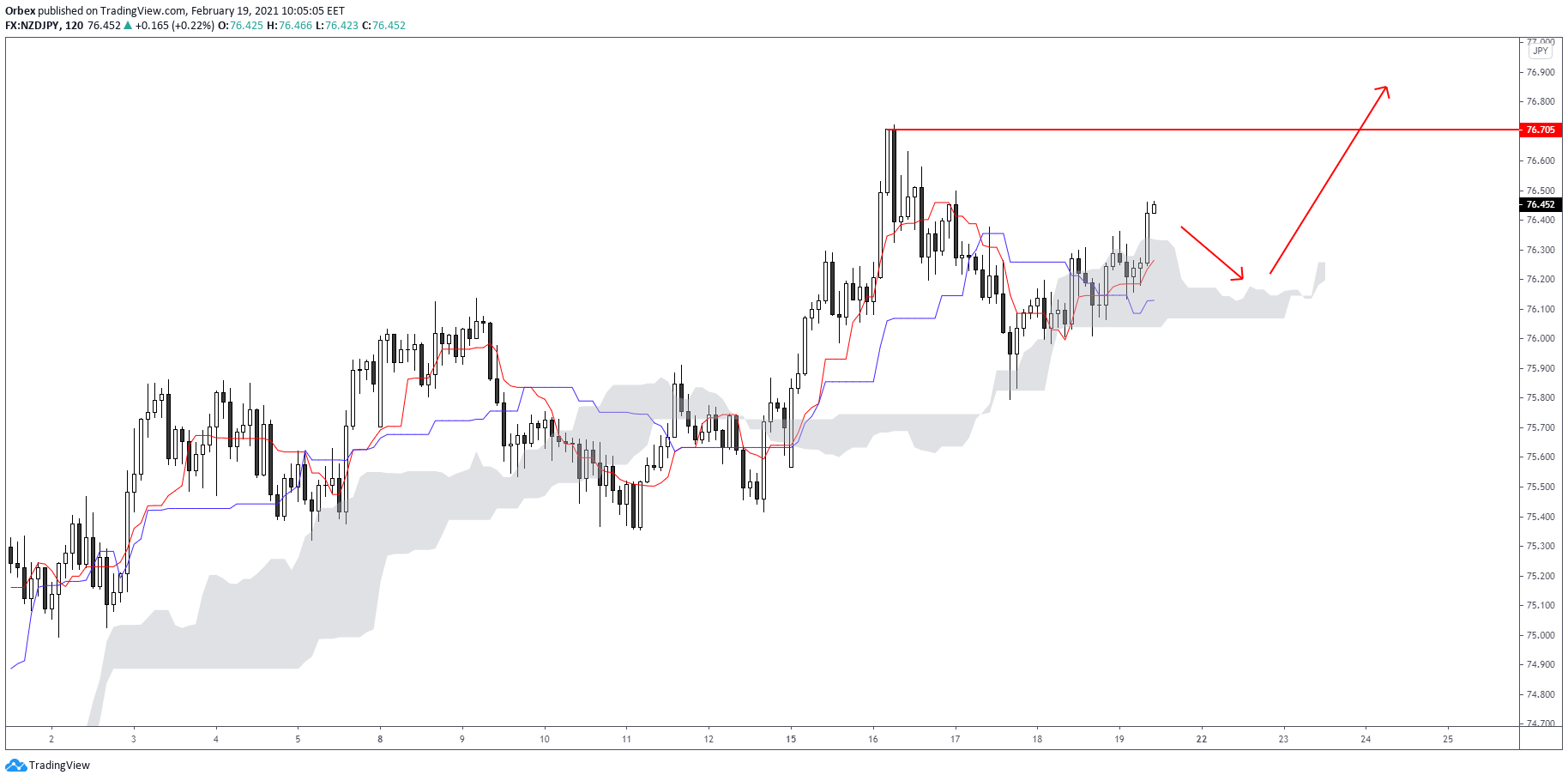 We now look ahead to a slight decent towards the Ichimoku cloud, before a bounce at the said level brings prices to higher highs. This would be apparent with a break at the recent peak of 76070.