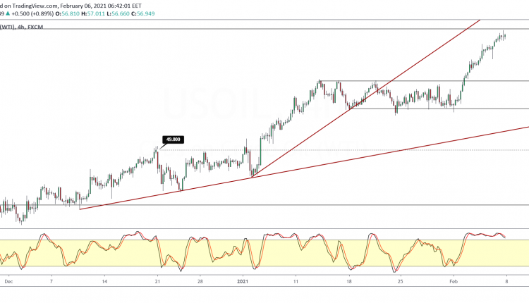 WTI Crude oil prices continued to advance with price action closing near a 13-month high. Prices briefly traded close to the next key resistance level of 57.35.