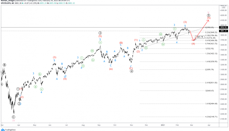 In the short term, we could see the market move lower in the corrective wave (4) to 3681.78. At that level, it will be at 61.8% of intermediate impulse wave (3).