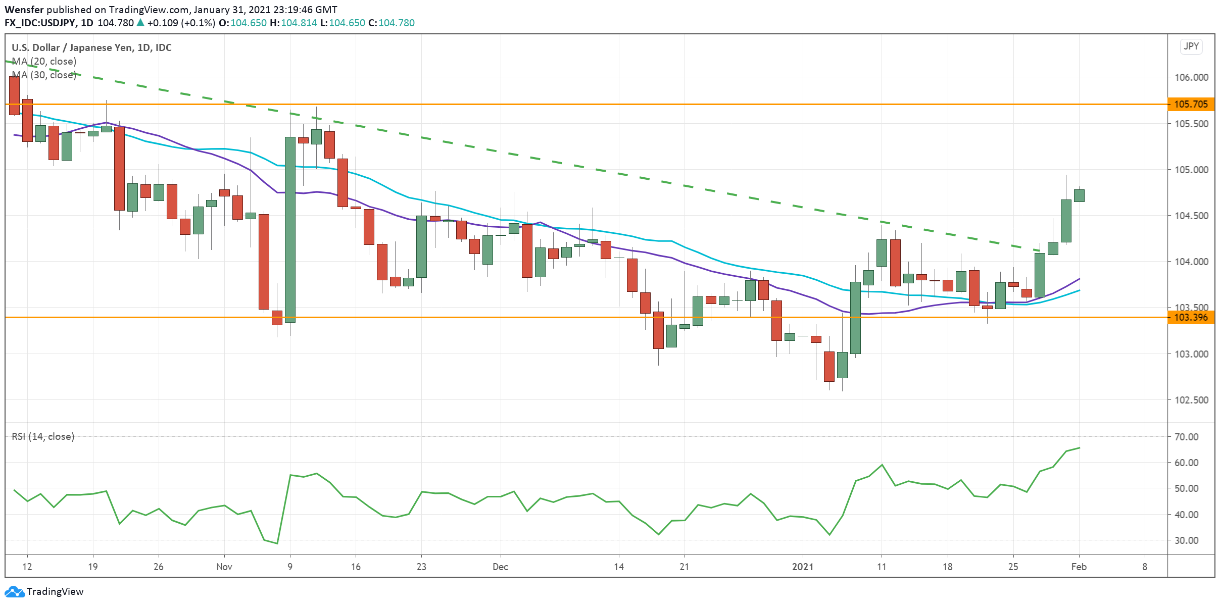 The US dollar has rallied above the seven-month-long bearish trendline, a sign of rising demand. As the short side begins to cover, the pair could gain momentum as long as it stays above the new support of 103.40.