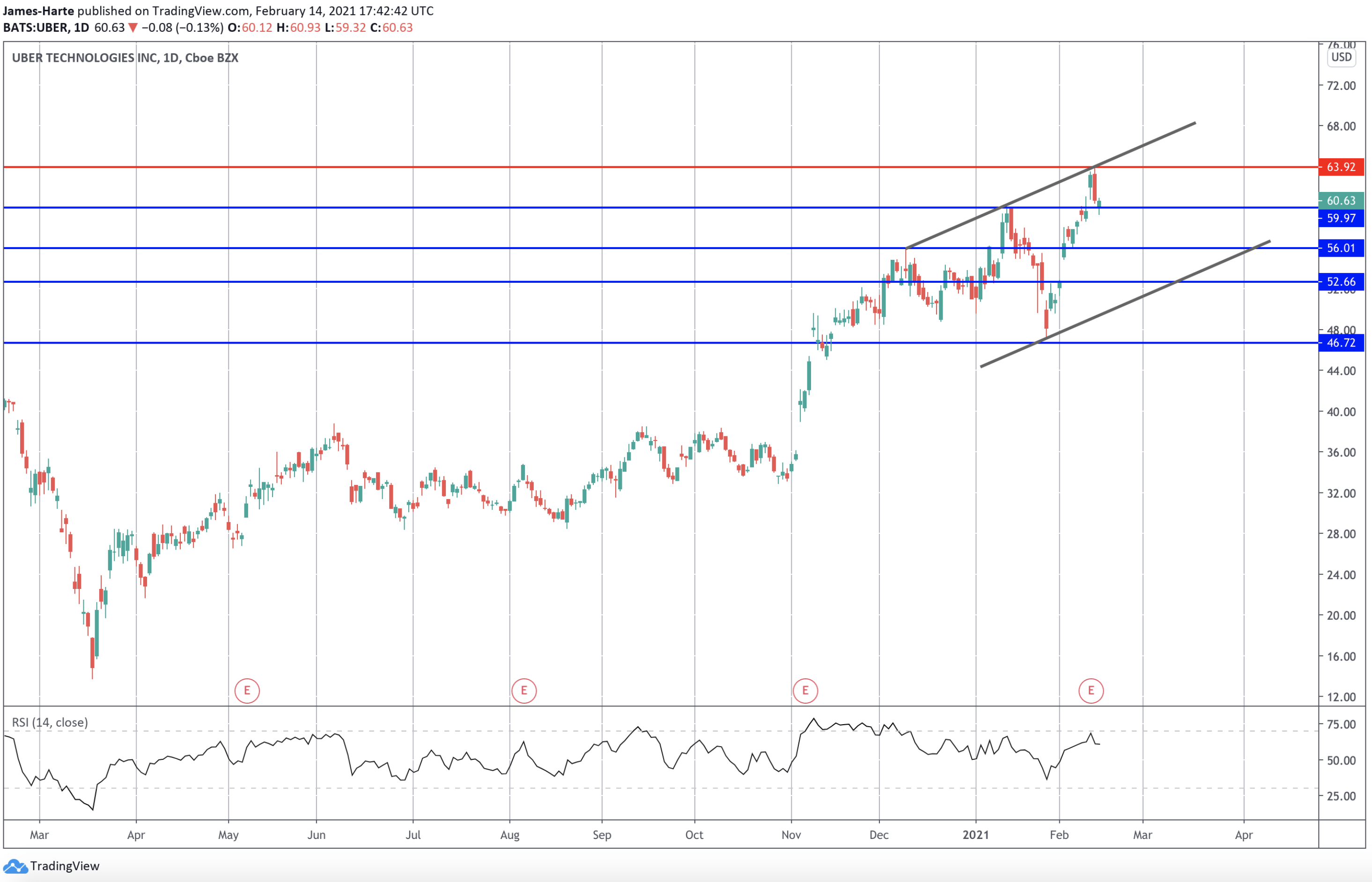 Shares in Uber have corrected lower from recent all-time highs. The company’s stock price has seen an impressive rally off the November 2020 lows. Price soared by over 93% off the 33 lows to highs of around 64 last week, recovering from a mid-rally correction over January.