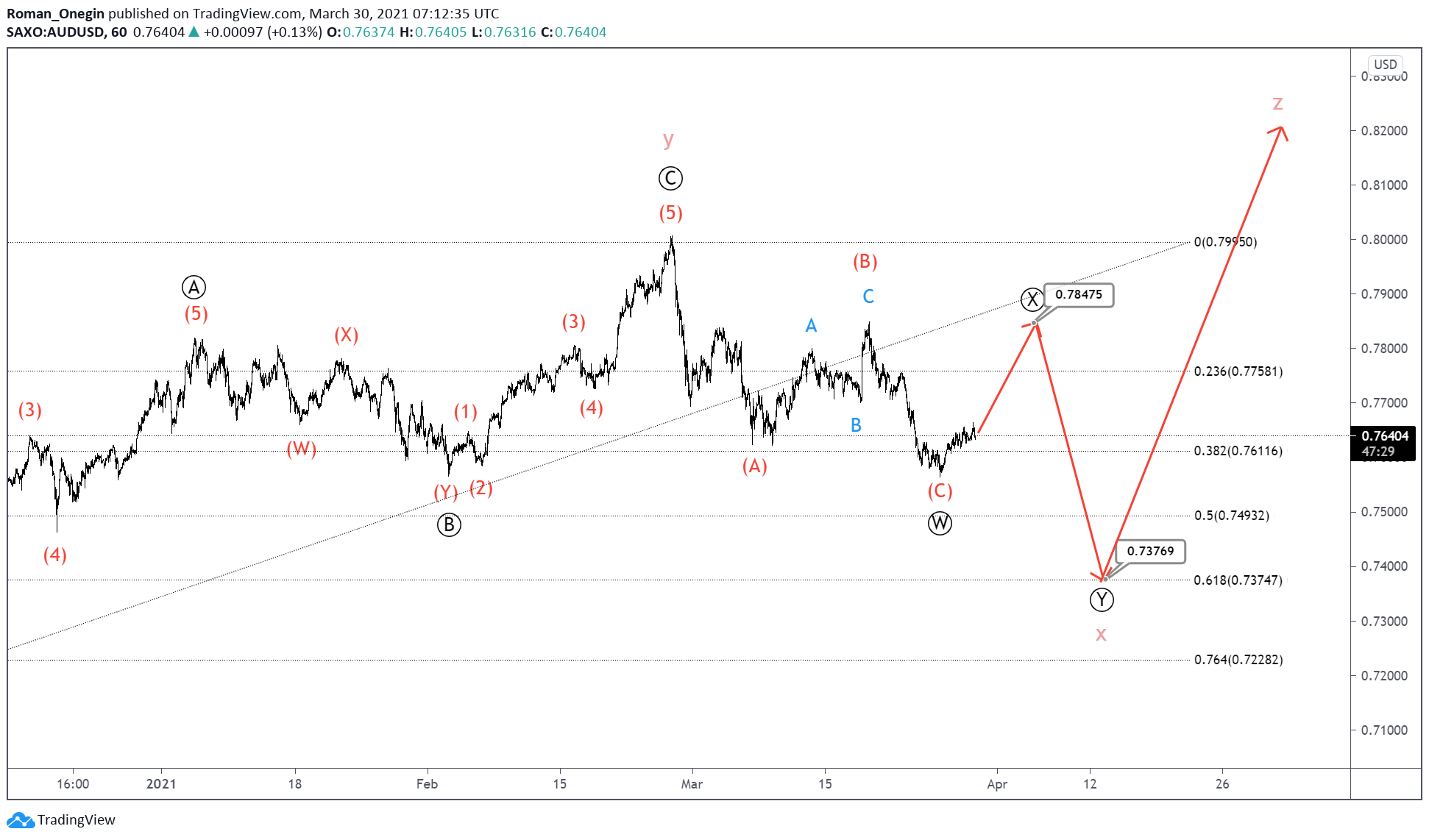 In this case, we can expect an increase to the level of 0.784 in the intervening wave Ⓧ. At that level, it will be at 61.8% of wave Ⓦ.