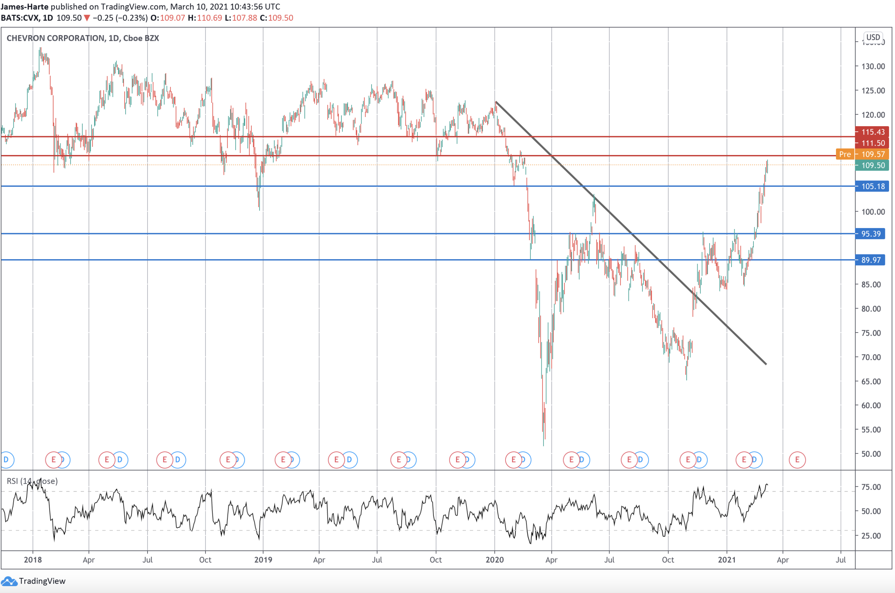 Chevron is trading higher pre-market on Wednesday as the energy company’s stock price continues to climb. Chevron has had an impressive start to the year with the company’s shares recovering from the 84.85 lows printed in February, to trade up to 109.57 currently, a solid 32% rally.