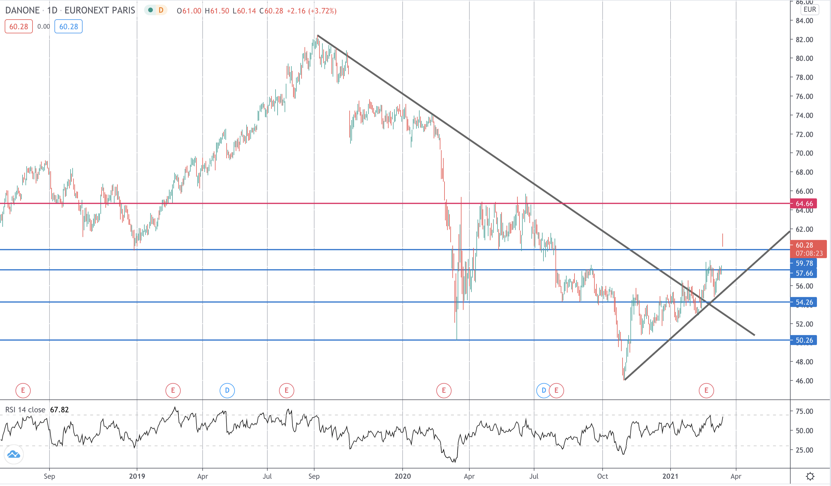 Danone shares gapped open by 5% on Friday before reversing lower over the session. However, shares are still sitting above the 59.78 level. This is ahead of the market open on Monday suggesting a continuation higher in the near term.