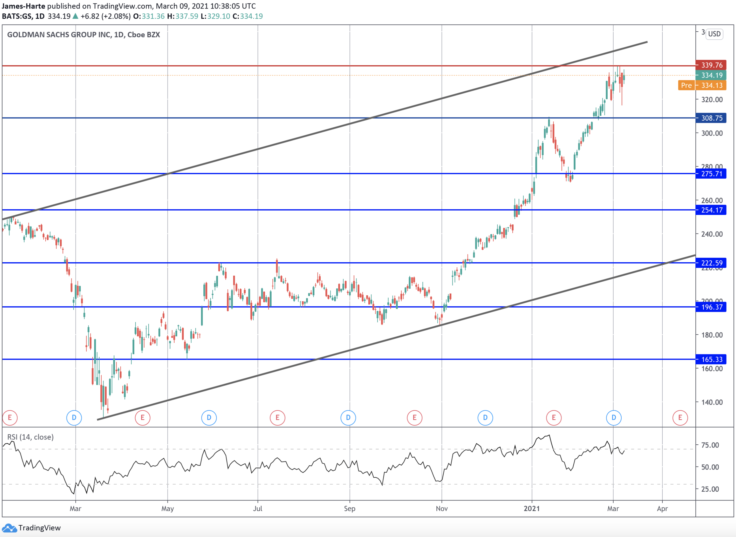 The rally in Goldman’s stock price this week has seen shares blowing above the 308.75 level to trade up to highs around the 339.76 level, just ahead of testing the channel top.