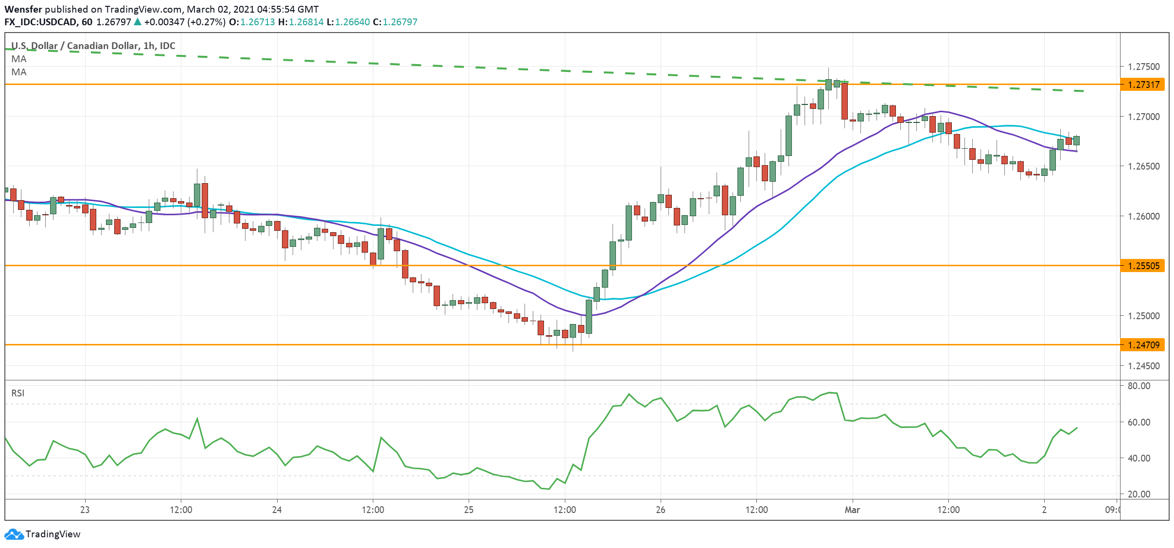 A solid reading could keep the US dollar subdued as the RSI cools off from the overbought area. As the 20-hour MA dips further below the 30-hour one, an indication of accelerating momentum, 1.2550 is the next target in sight.