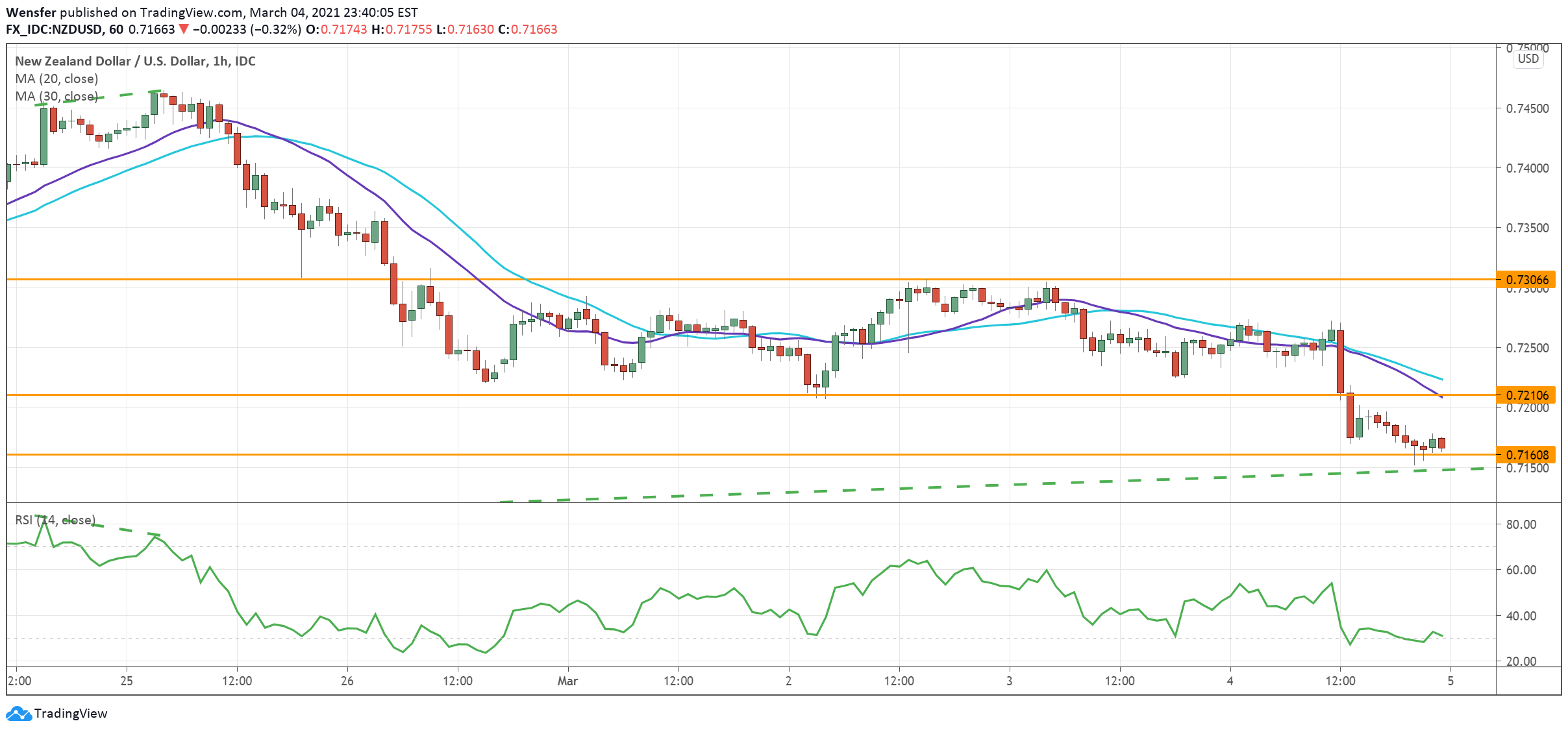 The bearish RSI divergence was the first sign of the kiwi’s overextension. A breakout below 0.7210 has initiated a second wave of sell-off towards the twelve-month long rising trendline.