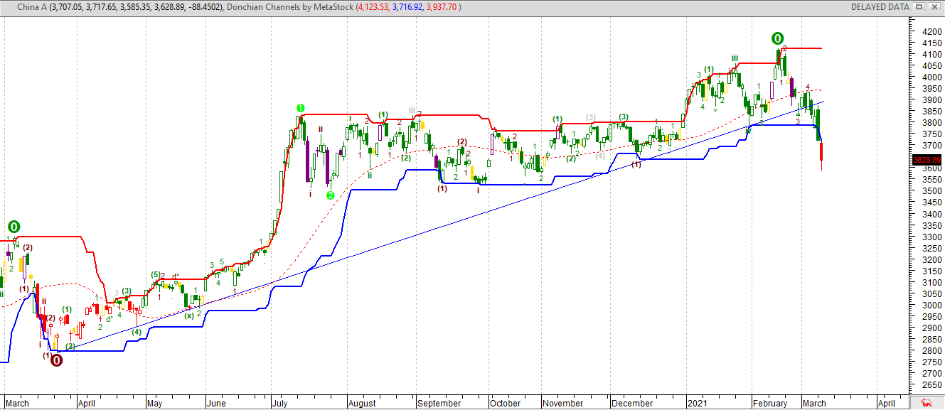 L’indice cinese CSI ha fulcrato un movimento ribassista sui massimi di fabbraio a 4.130. La flessione seguente ha trovato un sostegno temporaneo in area 3.900 violata successivamente con “boost” ribassista e test in vellcità sui supporto in area 3.600. Un’azione tecnica scaturita con elevata magnitudo e e accompagnata anche dalla componente stagionale, letta in chiave negativa. Per le implicazioni tecniche assunte dai sistemi di modellazione predittiva, le quotazioni dell’indice CSI dovrebbero continuare a ruotare ancora tra 3,500 e 3,600 per qualche tempo, con finalità correttive prezzo/tempo, per garantire un ricambio delle correnti operative oltreché una necessaria ricomposizione del quadro dinamico su livelli più equilibrati. Negatività solo sotto quota 3,500.