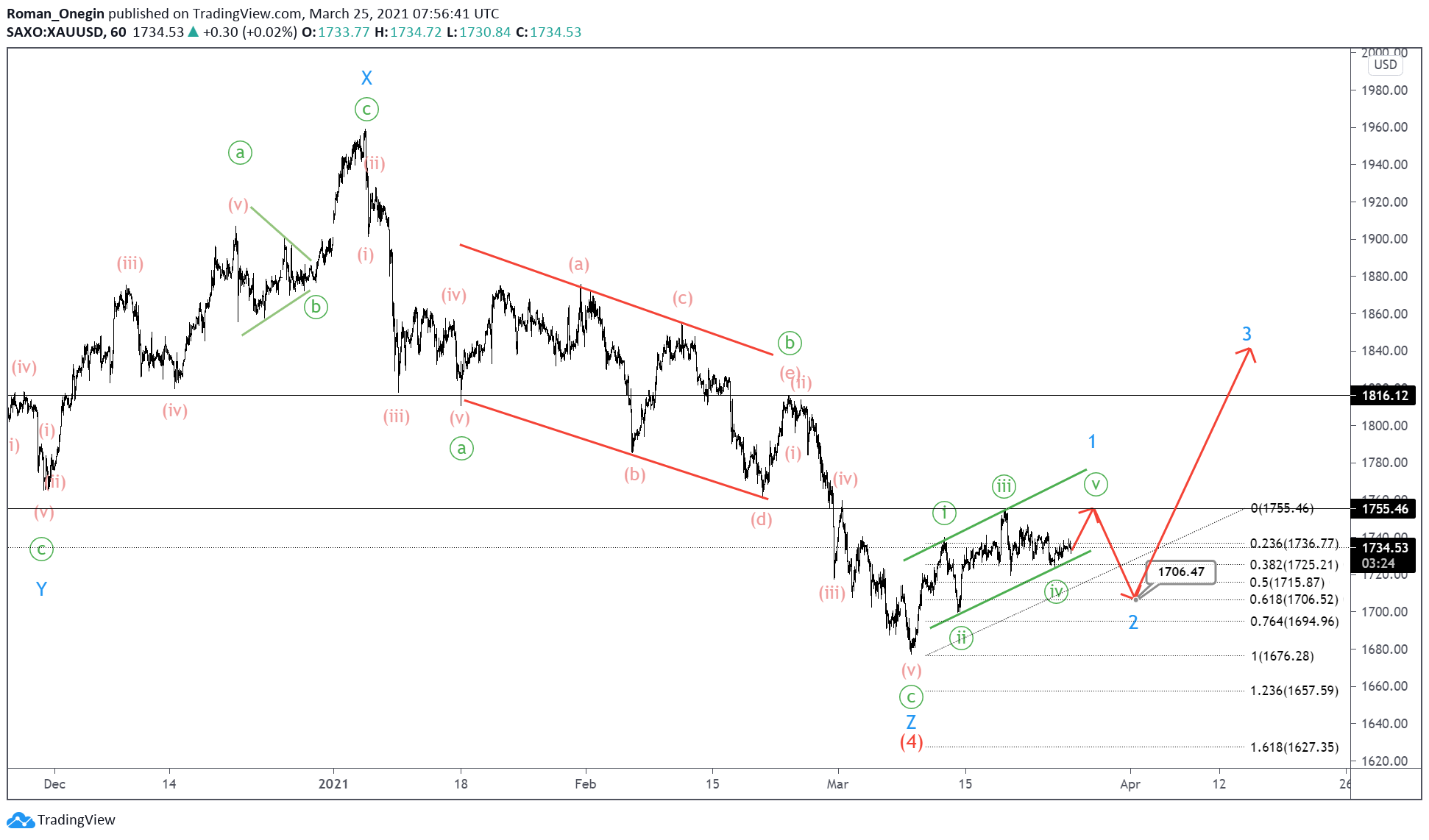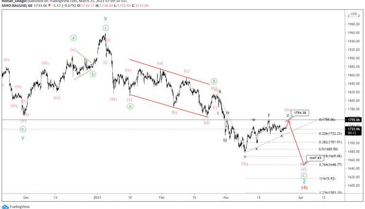 XAUUSD seems to be developing a large corrective wave (4) of the intermediate degree, which has a complex structure and takes the form of a bearish triple zigzag.