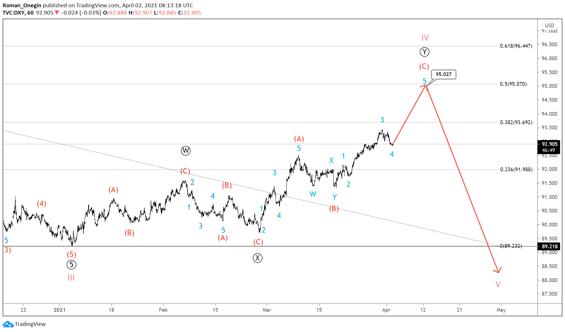 Perhaps the minor fourth wave of impulse (C) has come to an end, so we are waiting for the final rise in wave 5 to the 95.02 area. At that level, primary wave Ⓨ will be at 50% of primary wave Ⓦ.