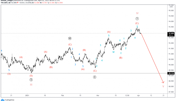 The current structure of the DXY index hints at the completion of the cycle correction IV. This correction took the form of a double zigzag of the primary degree.